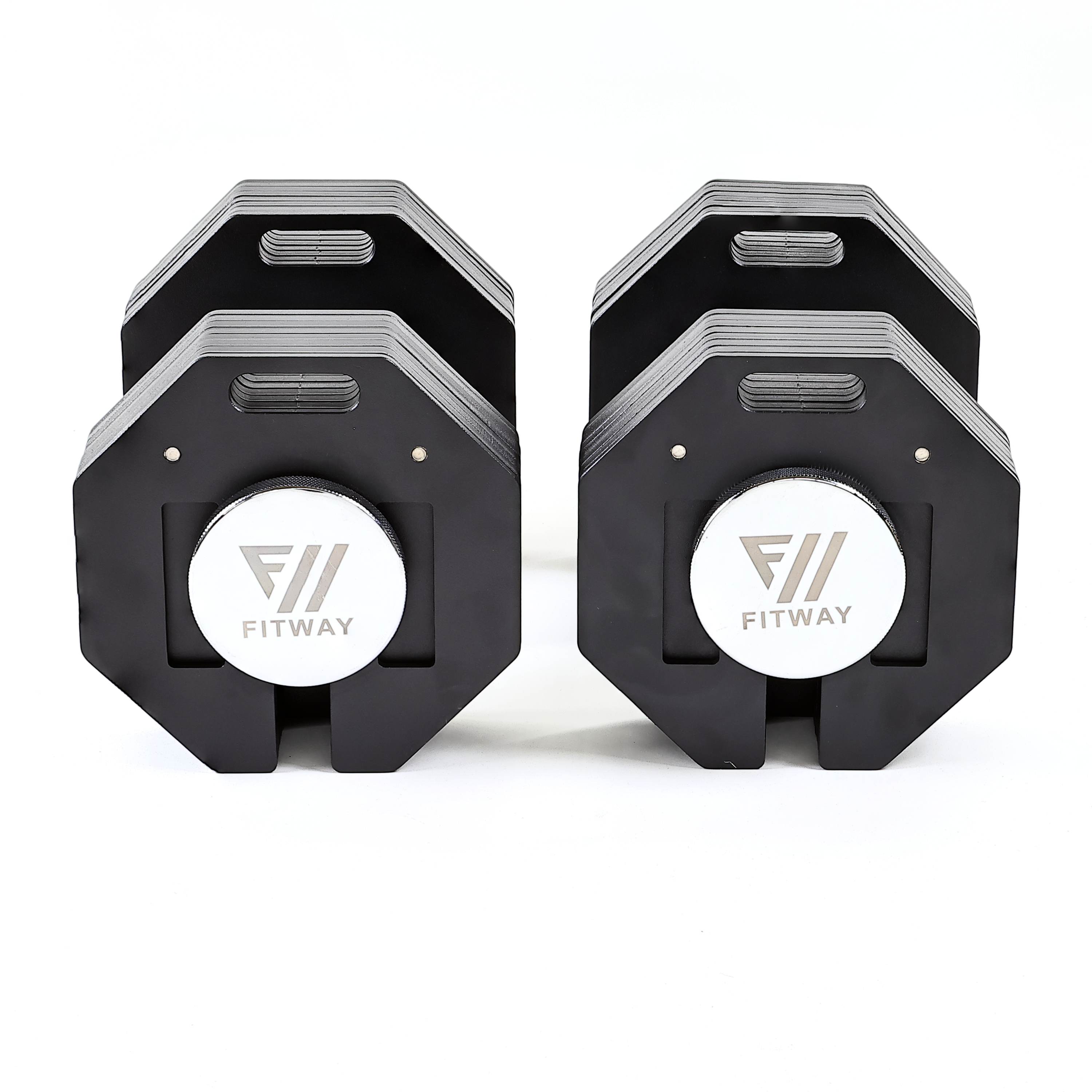 Save space and money with the FitWay 80lb adjustable dumbbell set! The sleek design and advanced construction make these dumbbells a valuable addition to any workout space.