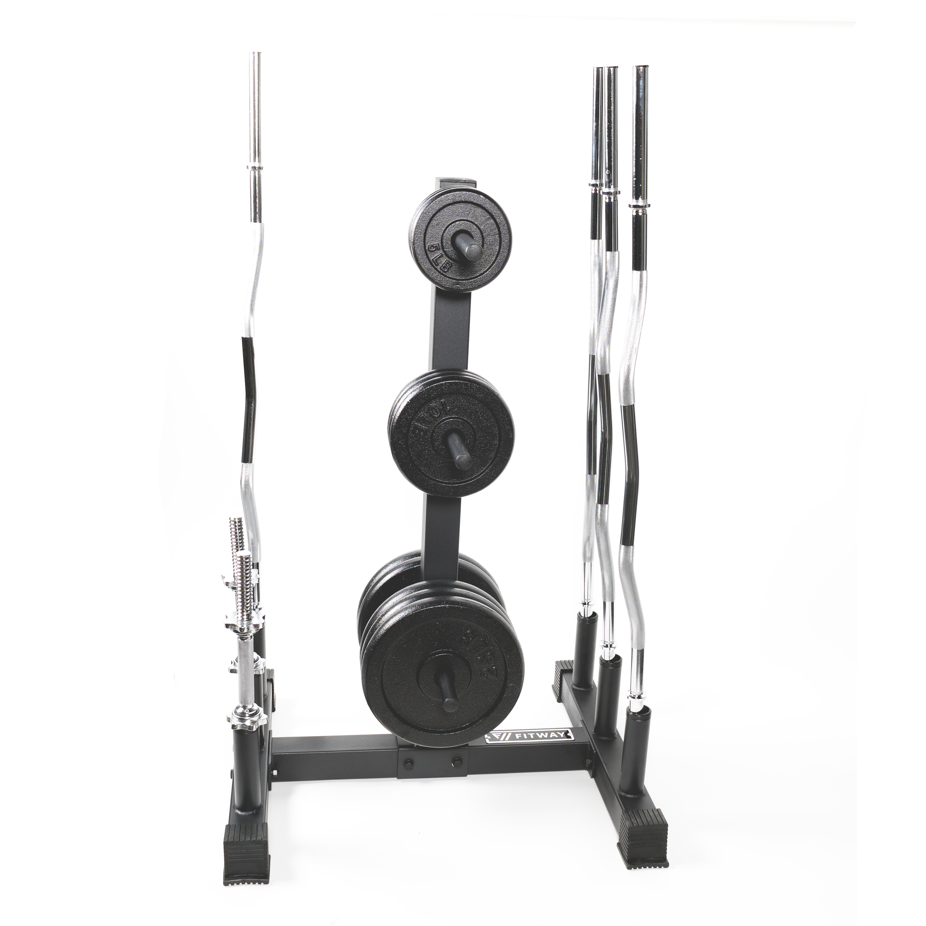 The Fitway Plate and Bar Rack is a durable and efficient storage solution designed for any gym. With heavy-gauge welded steel construction and six weight plate storage posts, this rack keeps your workout space organized and clutter-free. The rubber foot tabs protect your floor while providing stability, making it a reliable choice for both home and commercial use.