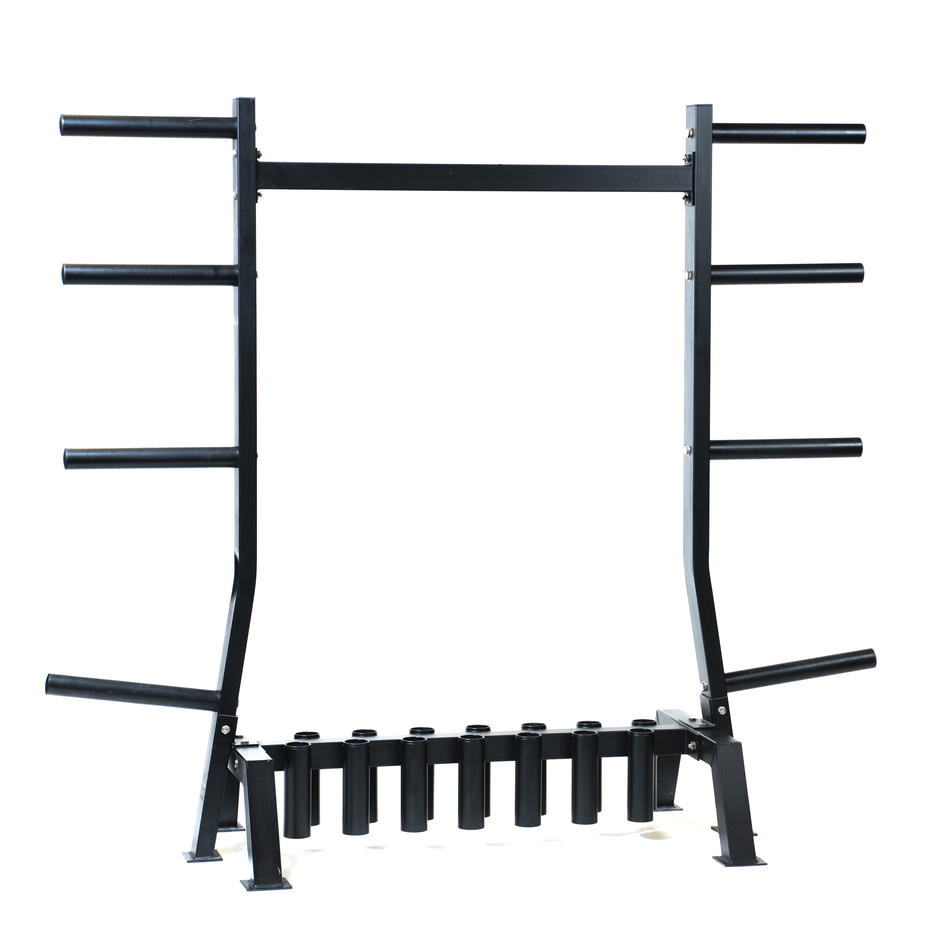 The FitWay Weight Storage System provides a convenient location to keep up to 14 olympic bars and all of your olympic plate over 8 weight storage posts.