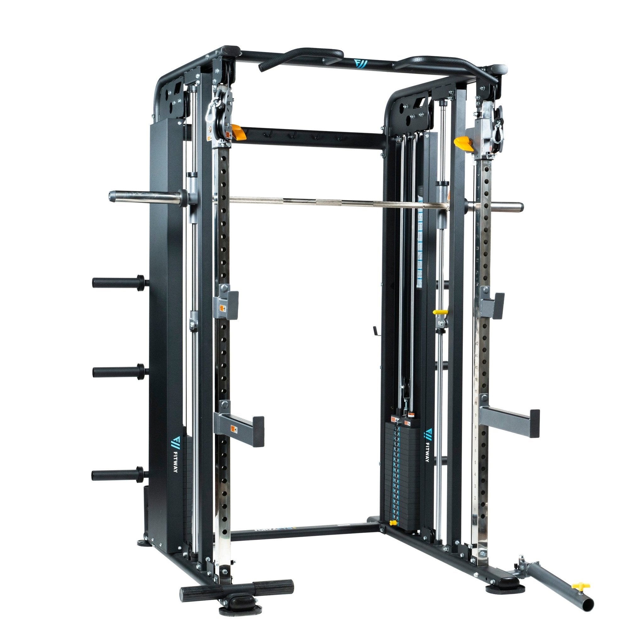 The FitWay Forza FTS+ is the flagship model in the Forza functional lineup. Providing the end user with a all-in-one complete gym package through multiple adjustable pulley positions, smith bar, plate/bar storage and key attachments. This machine comes with J-hooks and Safety spotter arms, which allows you to quickly switch from using the pulleys to a fully functioning rack. With all the features included in this one machine, the exercise options are endless.